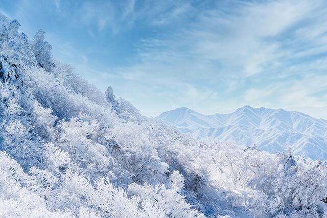 덕유산 국립공원의 환상적인 상고대는 한 폭의 수묵화를 보는 듯한 감동을 줍니다.