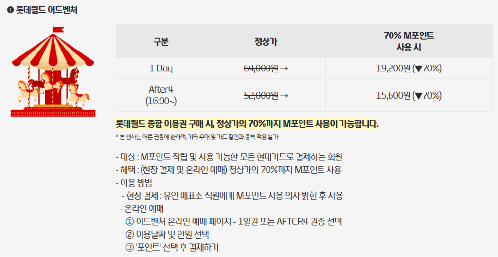 할인 가격과 기간은 수시로 변경되니 롯데월드 웹 사이트의 이달의 혜택 페이지에서 확인 해보시기 바랍니다.