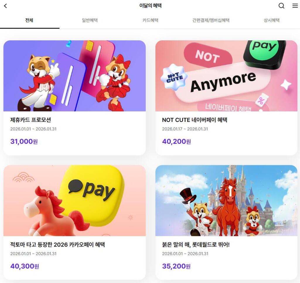 카카오뱅크 사용자라면 앱 내 ‘혜택받기’ 메뉴를 통해 본인 한정으로 40% 할인을 받을 수 있어 카드 실적이 부족한 분들에게 훌륭한 대안이 됩니다.