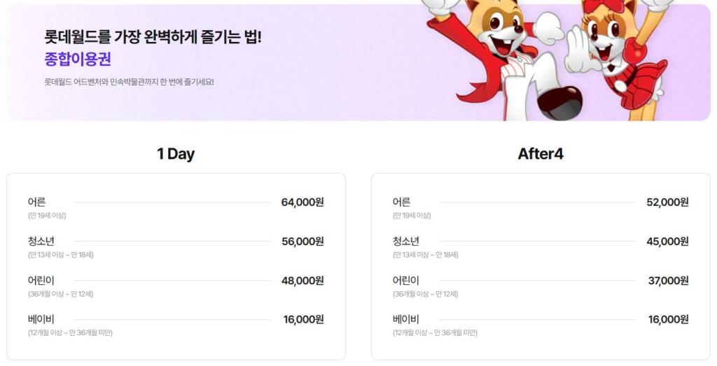 기본적으로 롯데월드 티켓은 이용 범위와 입장 시간에 따라 종합이용권과 파크이용권으로 구분되는데요. 민속박물관까지 함께 관람할 수 있는 종합이용권의 경우 성인 기준 1일권이 64,000원이며 오후 4시 이후 입장하는 After4권은 52,000원에 책정되어 있습니다.