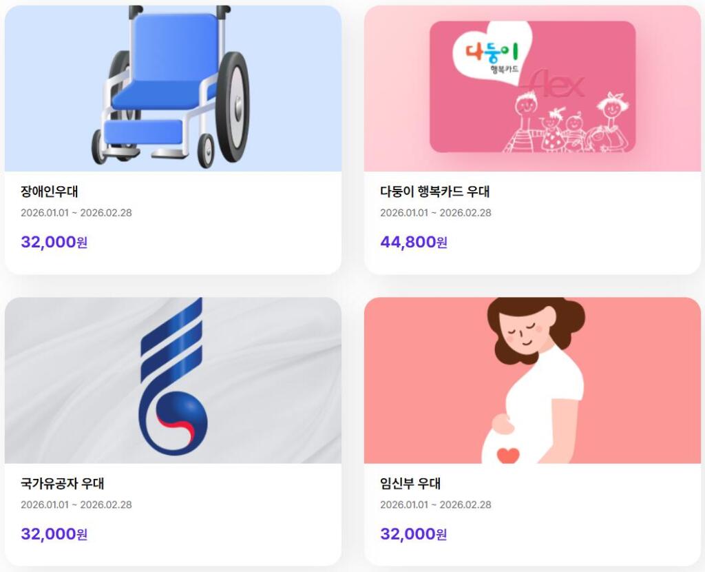 상시 운영되는 혜택으로는 대표적으로 장애인 우대 할인, 다둥이 행복카드 우대 할인, 국가유공자 우대 할인, 임신부 우대 할인이 있습니다.
