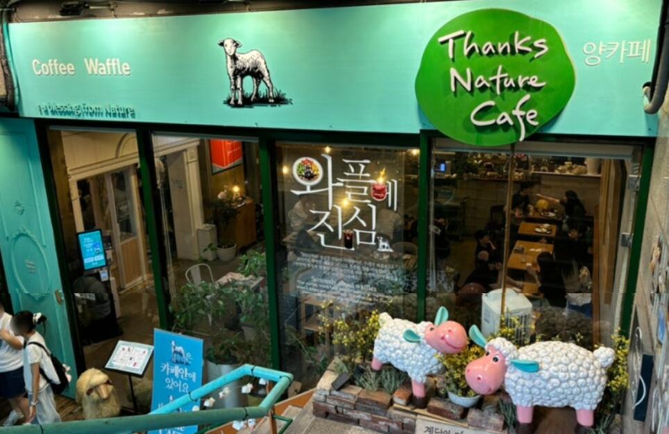 땡스 네이처는 애니멀 카페로 양을 비롯해 귀여운 동물들을 볼 수 있습니다. 동물들과 함께 휴식한다는 콘셉트에 음료와 디저트도 맛있습니다.