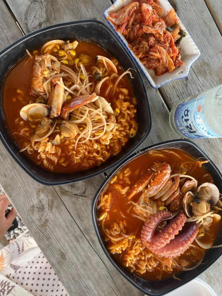 겨울철에도 실내에서 뜨끈한 해물라면 한 그릇이 바다를 보며 먹으면 여행의 즐거움이 배가되었습니다.