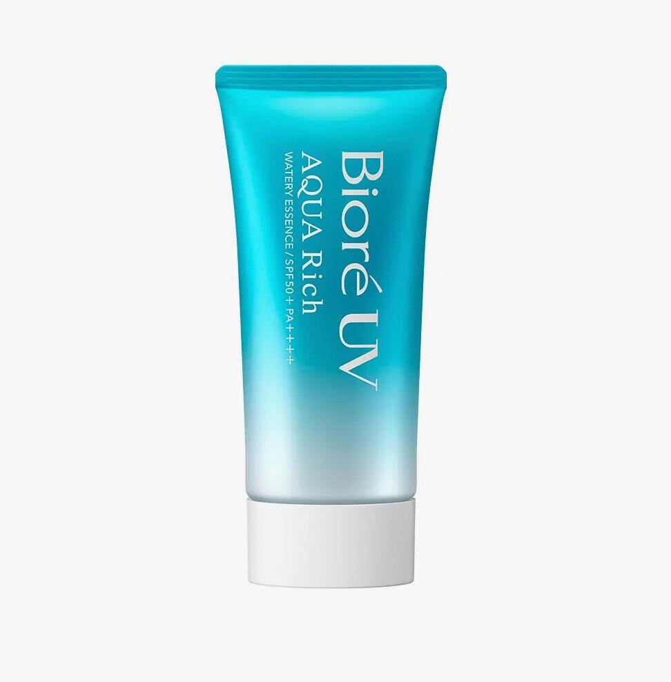 비오레 아쿠아 리치 선크림은 에센스처럼 가볍게 발리며 메이크업 베이스 대용으로 쓰기에도 아주 훌륭합니다.