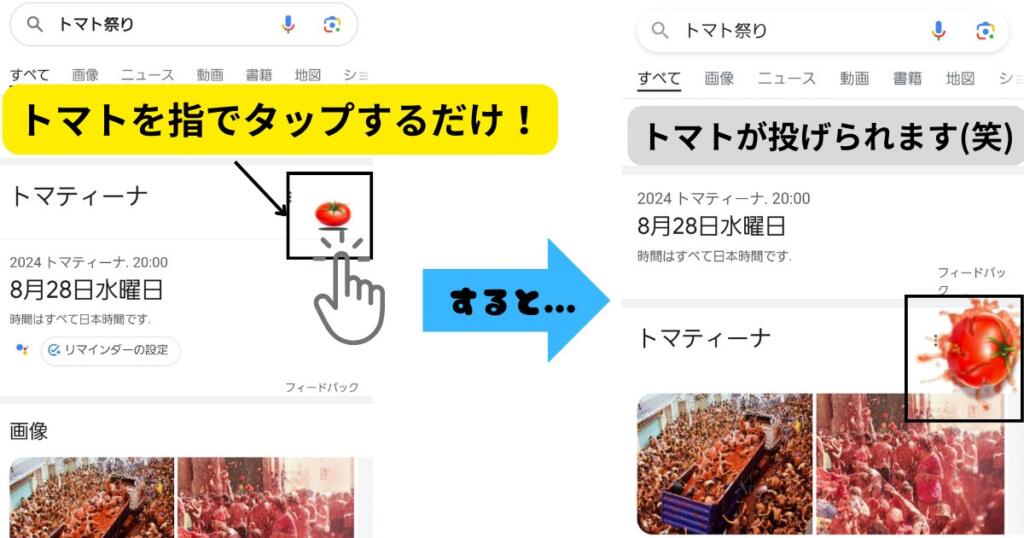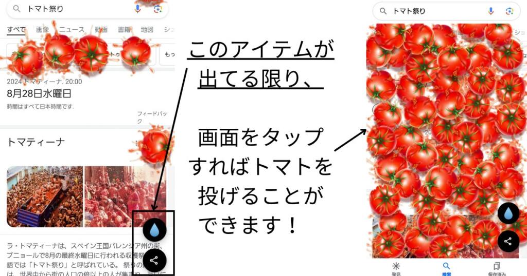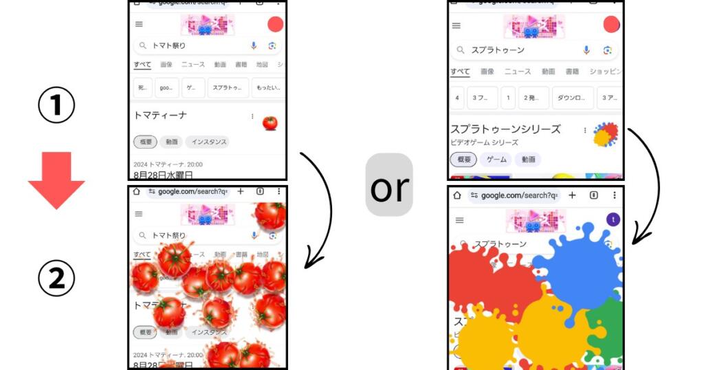 「토마토 축제」와 「스플래툰」의 숨겨진 명령어는, 구글 검색창에 ‘토마토 축제’ 또는 ‘스플래툰’이라고 입력하기만 하면 준비 완료입니다!・・・①