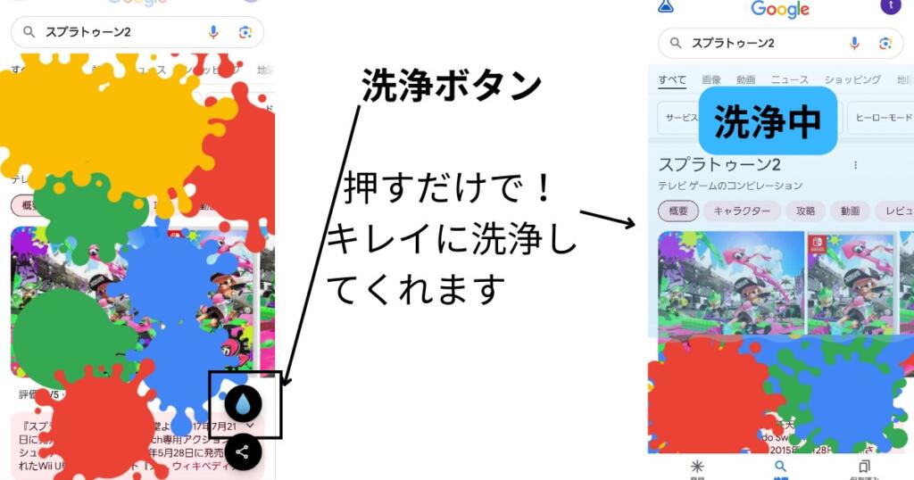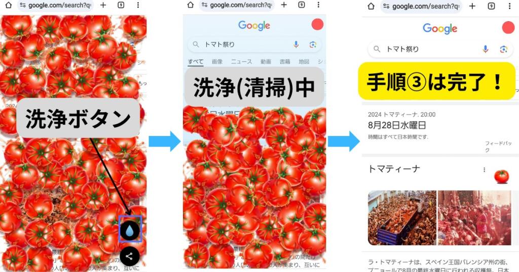 세척 버튼을 누르면 한 번에 청소해 줍니다. 구글 토마토 축제는 종료입니다. 그래도 구글 화면에 장난치고 싶다면, 몇 번이고 구글 토마토 축제를 다시 시작할 수 있습니다.