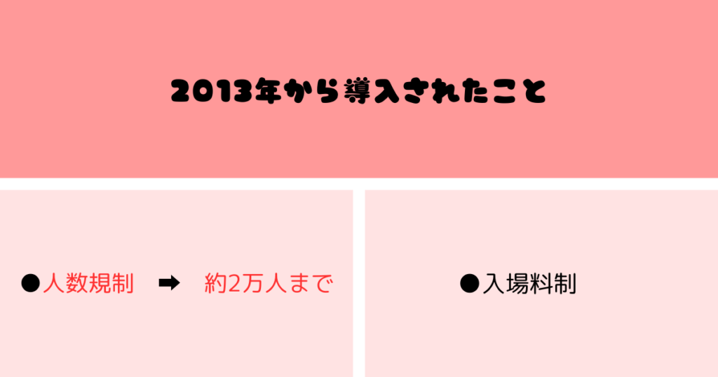 2013년부터 시행되었지만, 안전을 확보하기 위해 실시된 것이 “인원 제한”과 “입장료 도입”입니다.