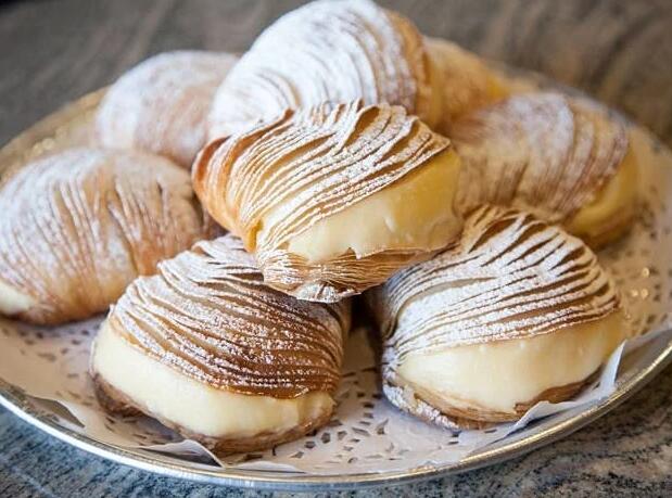 스포리아텔라는 조개 모양을 닮은 나폴리 지역의 전통 페이스트리로 겹겹의 페이스트리 속에 달콤한 소가 가득 차 있습니다.