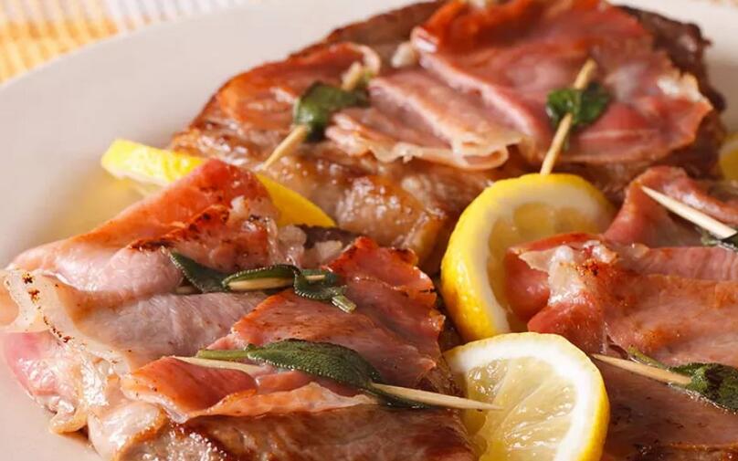 ‘입안으로 뛰어든다’는 뜻의 살팀보카는 얇게 썬 송아지 고기에 프로슈토와 세이지 잎을 얹어 구운 로마 전통 요리입니다.